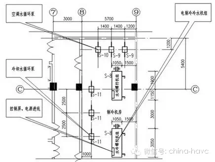 图5.1为电制冷水冷式冷水机组的图面示意,一般来说,在图纸上设备以方框表示,图中的电制冷水冷式冷水机组为水冷螺杆式冷水机组,我们可以看到主要的接管有空调水接管、冷却水接管,均为一进一出,旁边的空调水循环泵、冷却水循环泵则与空调主机配套形成完整的制冷循环过程。设备接管位置需要留出安装检修空间。而设备控制屏和电源进线位置则需要留出操作空间。设备的参数等要求应由图纸的设备表查出。