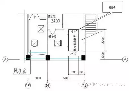 图5.2为热水锅炉的图面示意,设备外形按比例绘制在锅炉房内,燃烧机位置的突出是表示该位置需要经常操作、检修和维护,需要留有足够的空间。在接管方面需要落实设备的要求,本例中设备表除标明设备供热能力参数外,还标明为内置两套换热器,分别提供空调热水和卫生热水,则锅炉本体应有空调热水的供回水接管和卫生热水的供回水接管,锅炉烟道接口、排污管接口、通气管接口等需要通过设备厂家提供的随机文件确认。