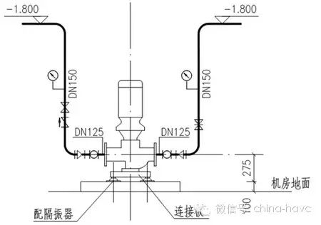 图5.3为水泵接管的图面示意,图中表示的为立式离心泵,进水管设有闸阀、变径管、软接头,出水管设有软接头、变径管、止回阀和球阀。进出水管上设置的压力表是为了在运行中了解水泵的实际运行参数。我们可以注意到,在设备的进出口接管段设有软接头,设备与基础的连接设有隔振器,这些是为了避免水泵运行的振动通过基础和管道传递出去。