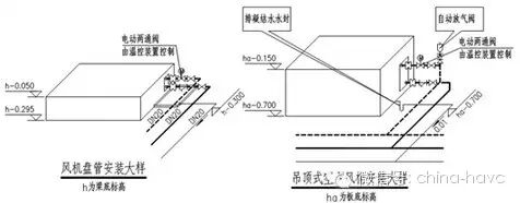 图5.5为末端设备的接管示意图,风机盘管与吊顶式风柜的水管接管均有三个接口,分别是供水管、回水管和凝结水管,考虑设备振动的因素,接口处均设置软接头。一般来说考虑排出设备内热交换盘管的空气气的因素,回水管在上,供水管在下,凝结水管为自流排水,因此在设备底部接管。两者也有不同之处,由于吊顶式风柜的处理风量大、风压高,设备的尺寸要比风机盘管大,一般要利用梁内空间安装,因此吊顶式风柜的回水管上需要设置自动放气阀,而风机盘管除了在设备本体设置手动放气阀外,一般可以在梁下安装,利用回水管将盘管内空气带出。在凝结水的接管处理上,风机盘管的凝结水盘是露在外部的,因而直接接管即可,吊顶式风柜因为凝结水盘在设备内部,运行时设备内部存在负压,凝结水管需要设置水封,以利于稳定地排出凝结水,在这个环节上吊顶式风柜与组合式空调机组是相同的。